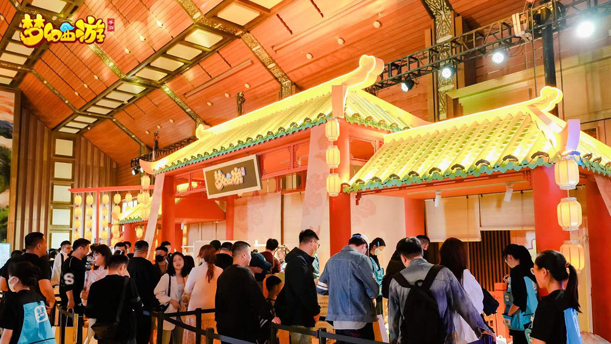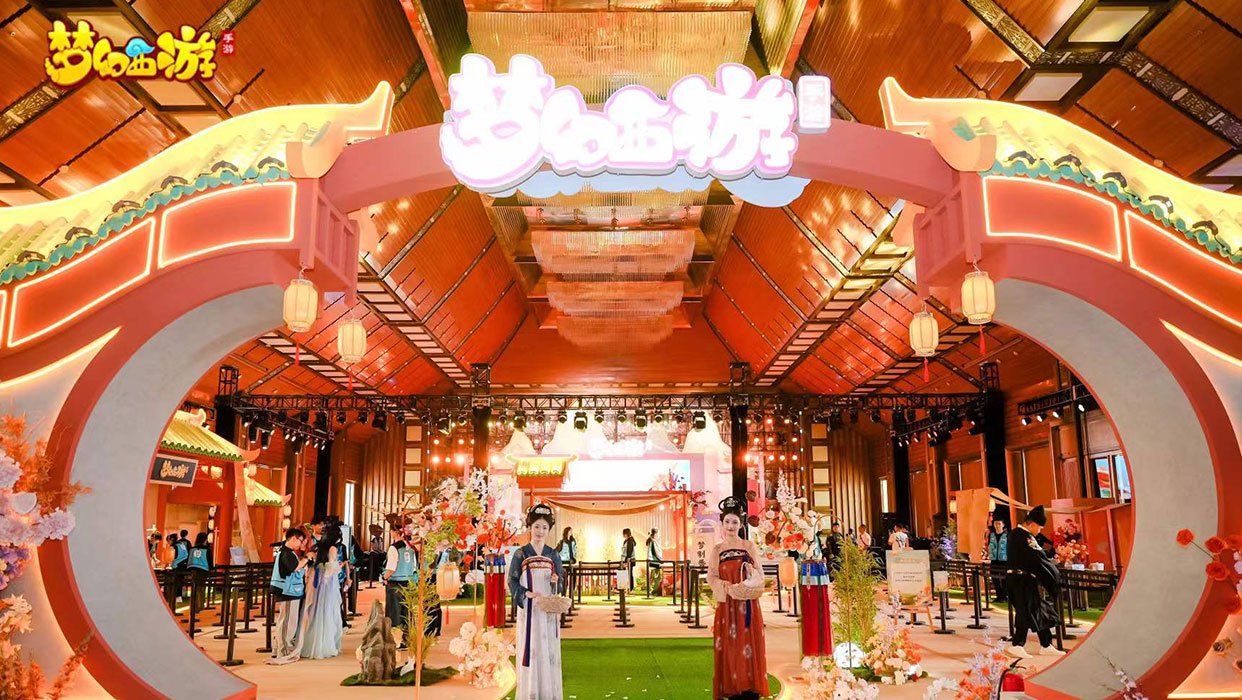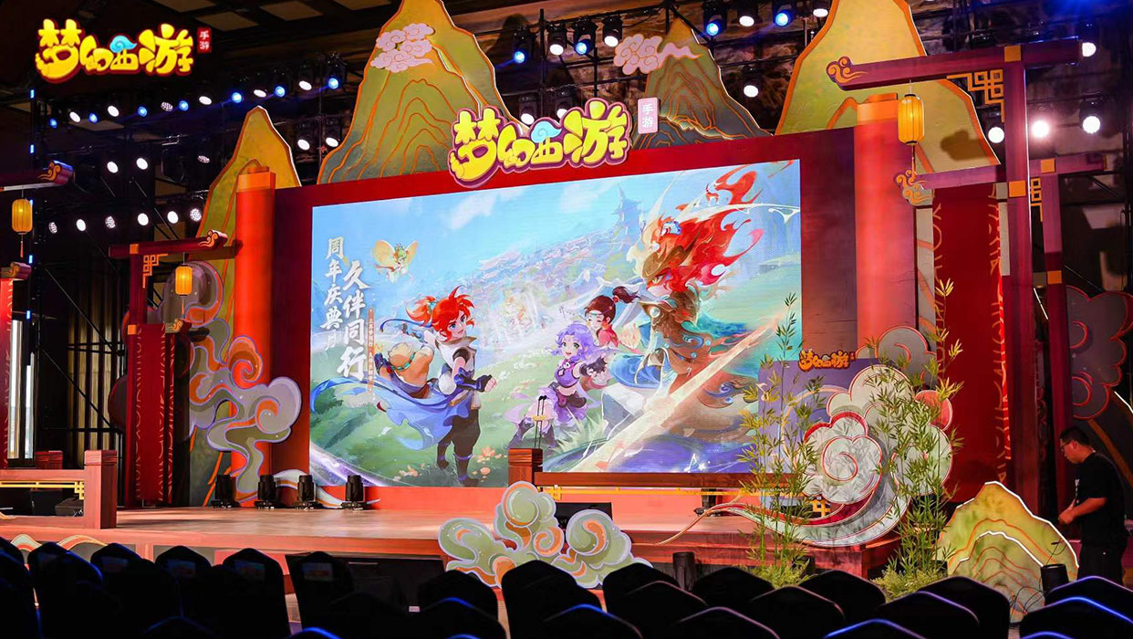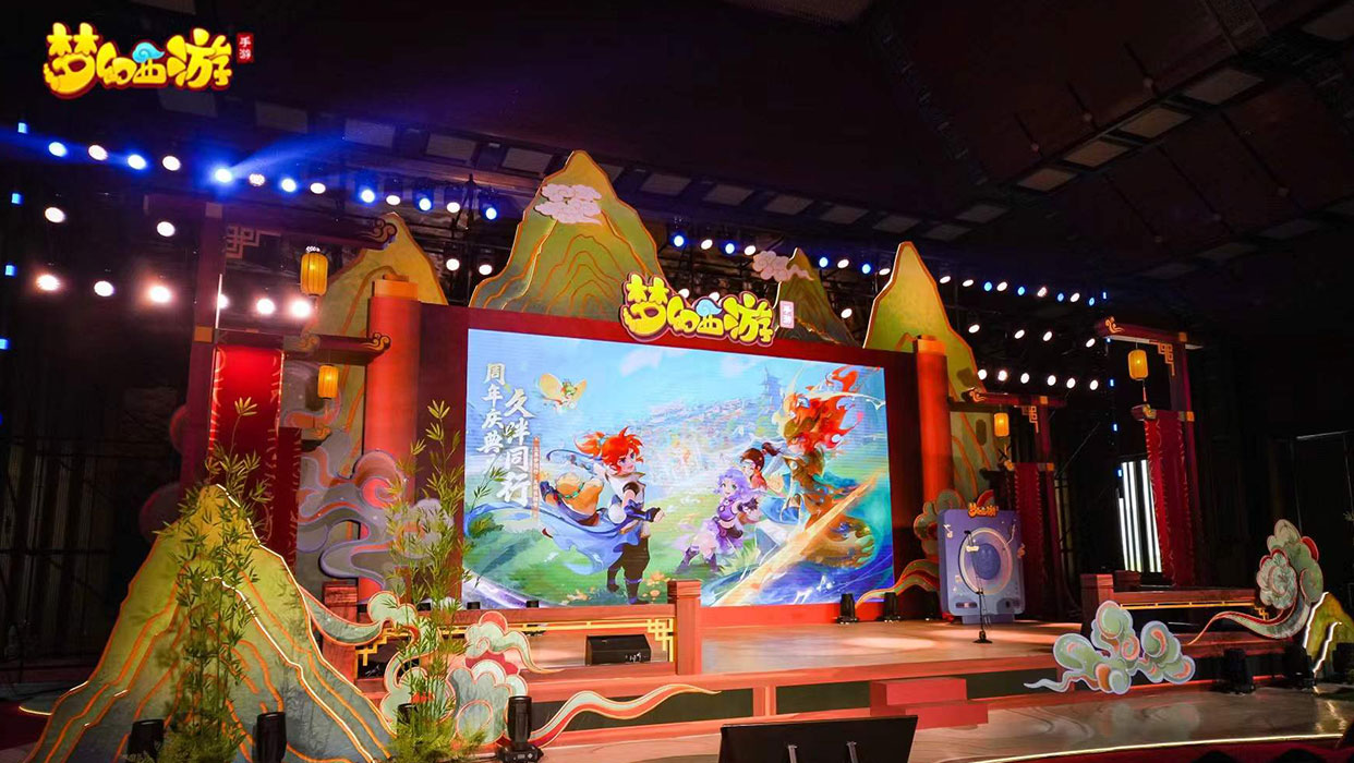 2024梦幻西游手游周年庆舞美以“国风沉浸+IP共振”为核心理念,构建虚实交融的庆典场域。主舞台以红金为主色调,中央大屏动态呈现游戏角色与“周年庆典·久伴同行”主题,强化IP记忆点;两侧山峦造型、灯笼卷轴等传统元素与青绿山水纹相互呼应,还原东方美学意境。灯光系统通过暖光烘托喜庆氛围,冷光勾勒山峦轮廓与云纹细节,配合地面竹纹、祥云装置,打造“山水环绕”的立体空间。整体设计将虚拟场景与现实舞台深度融合,既以国风符号传递文化底蕴,又通过玩家熟悉的角色形象唤醒情感联结,实现“从游戏到庆典”的沉浸式体验,呼应“久伴同行”的温暖主题。